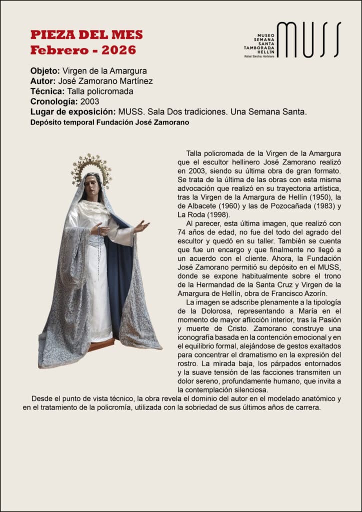 La pieza se encuentra expuesta en la sección “Dos Tradiciones. Una Semana Santa” de la exposición permanente del MUSS, siendo propiedad de Isabel Rubio Torres.