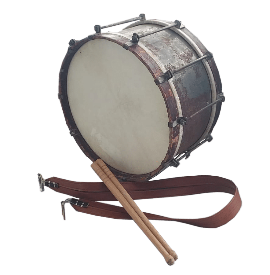 Ambos aros están sujetos por tornillos metálicos simples, sin palometas. La piel inferior presenta una bordonera de siete hilos tensores de nailon, que está en contacto con la membrana y recorre el casco, vibrando conjuntamente. Conserva, además cinto de cuero para colgar el tambor al hombro.